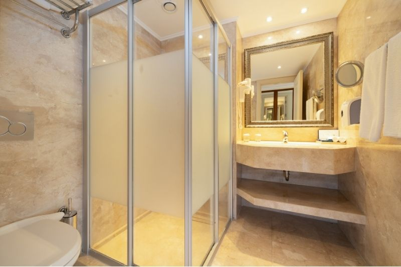 Same size as the standard rooms, this refurbished room stands out with its marble flooring and modern furnishings, alongside a bathroom with a shower cabin and a private balcony. Amenities include air conditioning, satellite TV, a hairdryer, minibar, tea and coffee setup, and a digital safe box, along with essential toiletries such as wall-mounted shampoo and shower gel.
