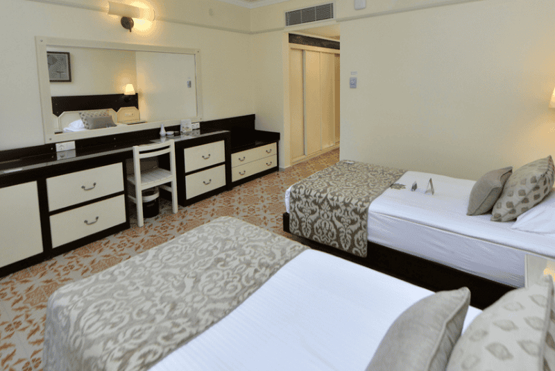 This room features two connected bedrooms with a modern design and marble flooring. The layout places the children’s room with twin beds at the entrance, followed by the parents’ room with a double bed. A full-size connecting door provides complete privacy between the two rooms. The room also includes a shared bathroom with a shower cabin and a balcony. Amenities include air conditioning, two satellite TVs, hair dryer, minibar, tea/coffee setup, and a digital safe box.